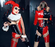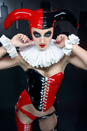 Shown with our Harley Quinn corporate shrug, a matching black/red plastic boned neck corset, Harley Quinn thigh corsets with high waisted underwear, with a matching black/red plastic boned neck corset. The second outfit combination shown with this corset is our Harley hood with neck ruff with optional wrist cuffs shown with Harley Quinn thigh corsets with matching basic underwear and matching red and black stockings.