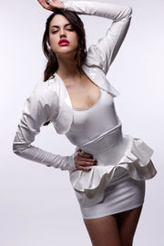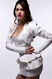 Our cute and versatile bolero shrug pairs well with glam goth or fetish outfits or as part of a full PVC look. Sewn with  ruffled upper sleeves which taper down into a slim fit lower arm. We designed this shrug with longer sleeves so it ends a little past the wrist with a little bit of ruffled crinoline sewn into the upper shoulder for volume.