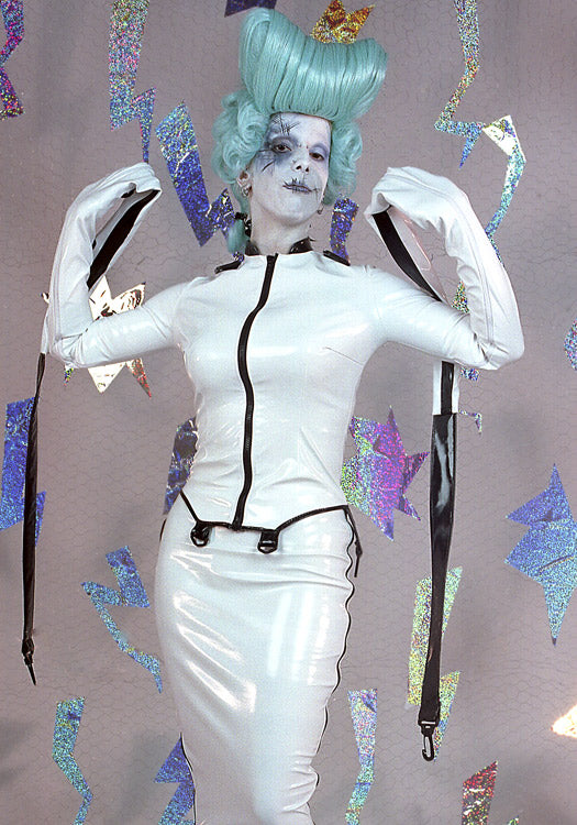 Our PVC straitjacket in your choice of colours with black straps, black trim along the side of the sleeves, a black collar, and a black zipper. Great for cosplay, this slim fit restraining straitjacket made from stretch PVC with multiple D-ring fixtures.
