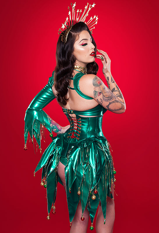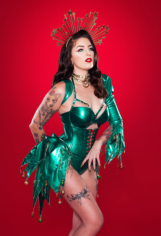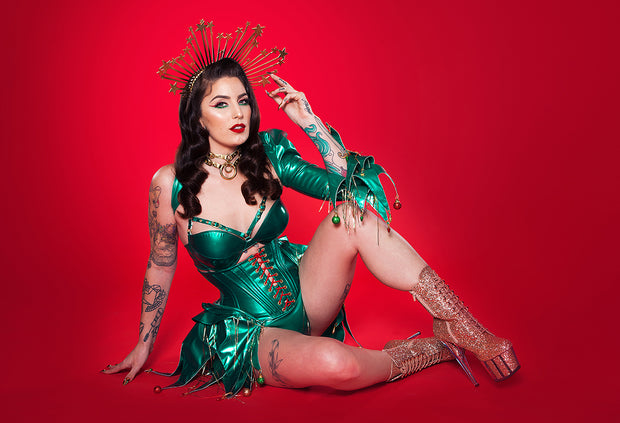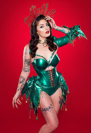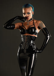 Thanks to your requests we have redesigned our underbust corset with eyelets on the front and back. While we can add front eyelets to any of our existing overbusts or underbusts for an extra $20 this product has the eyelets included in the price and is our newest and most flattering underbust corset shape. This shape is perfect when paired with PVC jumpsuits or lingerie. We sew this with four flat steel bones on the front for stomach flattening, flexible spiral steel boning sides, and flat steel boning at the back along the eyelets.