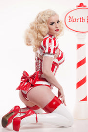 Our red/white padded PVC pushup bra with under-wire, an adjustable length halter neck strap, and an adjustable plastic quick release snap in the back. We can sew a red bow on the front centre for an extra $15 using the options above! Available in all our store colours here. Shown with our Candy Cane Underwear and our Candy Cane high waisted Underwear.
