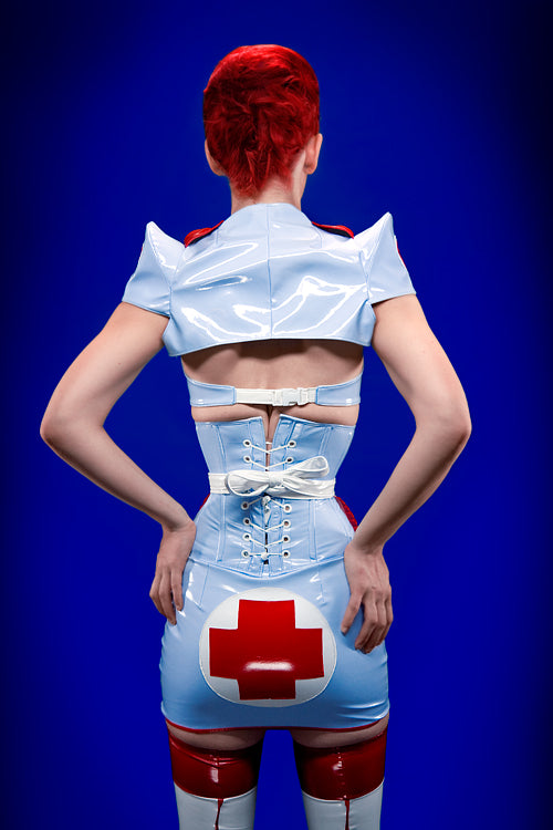 A cute simple nurse shrug which can be mixed and matched with your regular PVC clothing for a adorably sexy nurse look! High pointed padded shoulders with buttoned front accents. If you would like this in a different colour combination we can do that for you. The standard colours as shown is Arctic blue (very pale grey toned blue) with white accents on the front and nurse logos on the sleeves and red epaulets on the shoulders. Please e-mail us after checkout or add a note to the comments of the order if you'd like us to use any other colour combination!