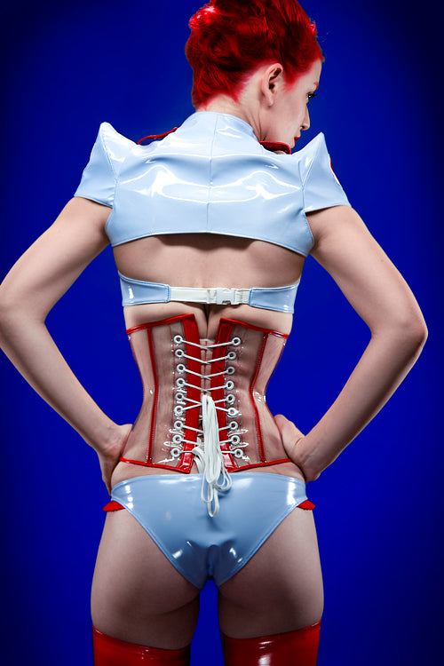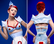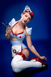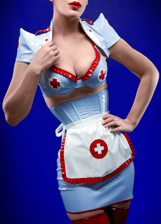 This outfit is our Padded PVC Nurse bra, Nurse Underwear, Nurse shrug, and with Clear PVC underbust Corset with painted boning. Also shown with a Nurse apron, and a Nurse Miniskirt.