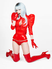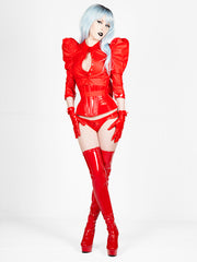 These panties have pleated accents on the side and a cute PVC bow sewn on the front! Available in all store colours with your choice of accent colour for the pleats and bow using the options below! Shown in regular shiny red PVC with matte (not shiny) accents.