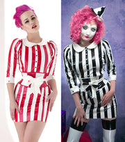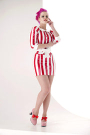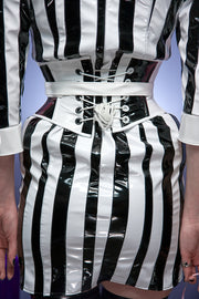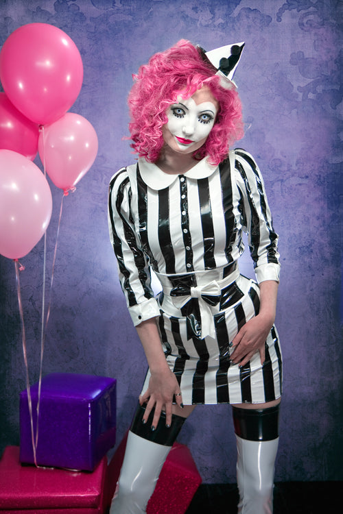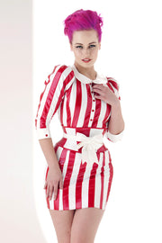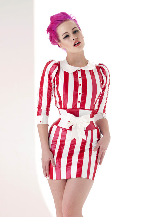Shown in white/metallic red with red buttons, a matching corset belt, and white bow. Also shown in white/black PVC, a matching corset belt, and white and black PVC bow.